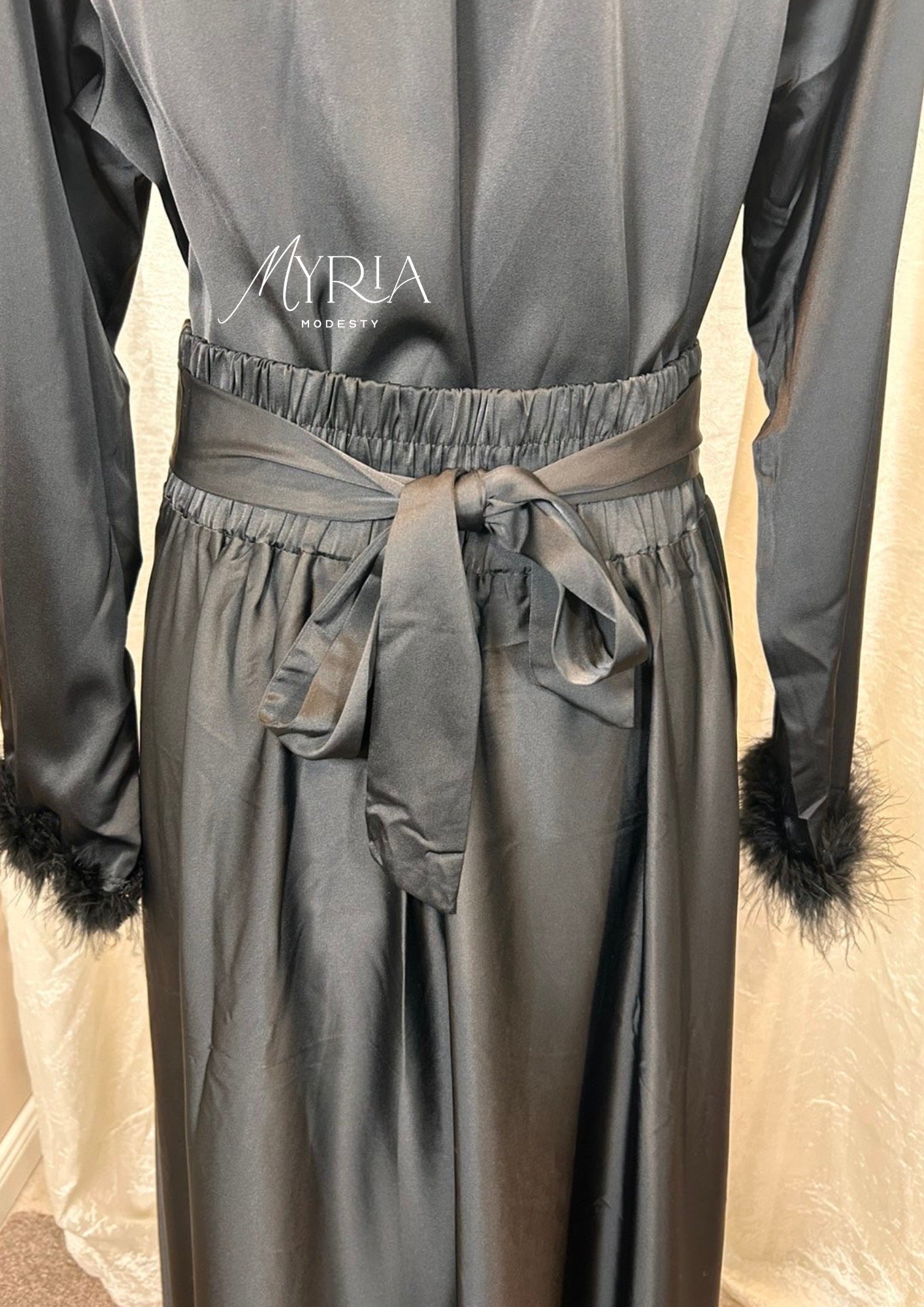 Apportez glamour et élégance à vos tenues avec cet ensemble top et jupe satiné en Noir. Le top fluide se distingue par son col légèrement montant, souligné par de jolis plis subtils, et ses manches longues aux poignets délicatement ornés d’un effet plume, qui ajoutent mouvement et sophistication à chaque geste.