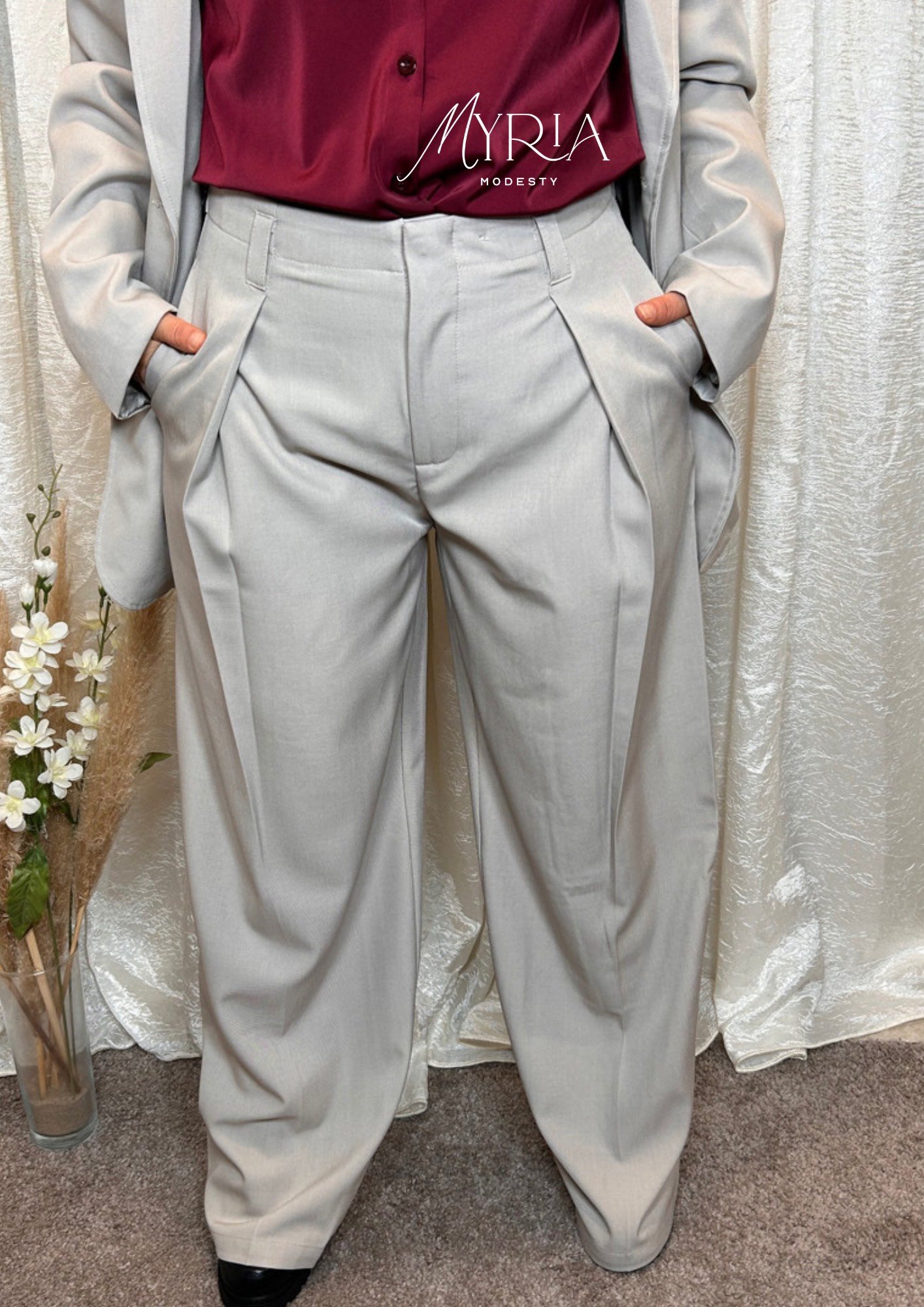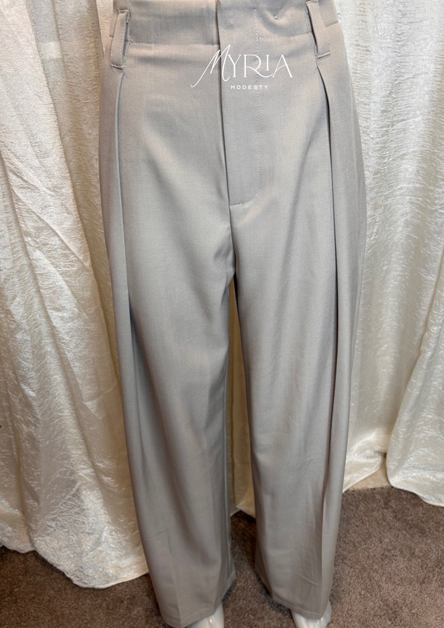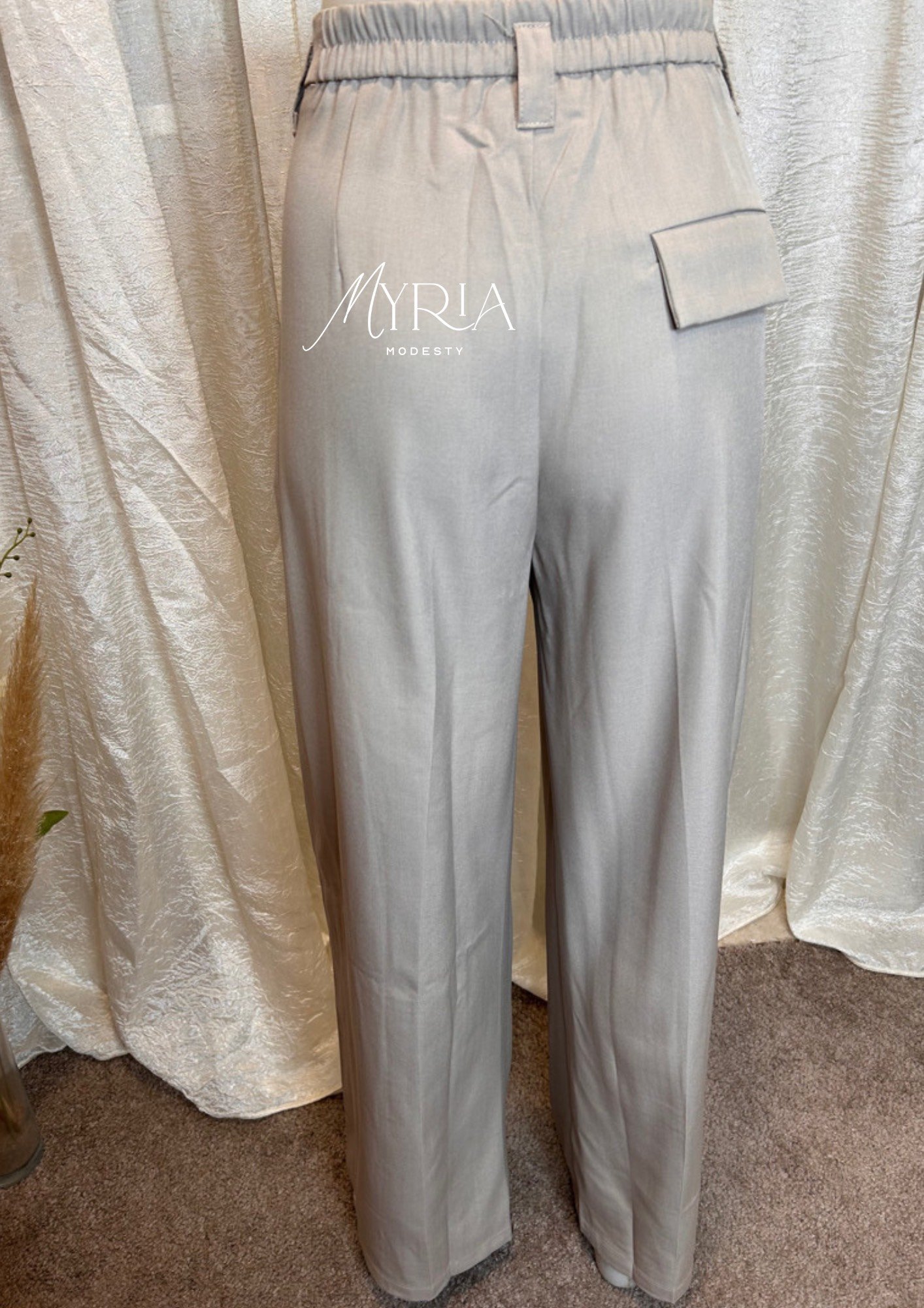 Pantalon taupe large et fluide avec taille élastique dos, fermeture invisible et plis élégants. Confort, style et silhouette structurée pour toutes vos tenues. ✨